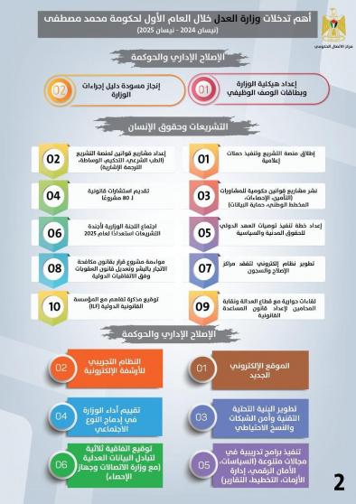 كما نشرت الوزارة مشاريع قوانين حكومية مثل: قانون التأمين، وتعديل قانون الإحصاء العام، والمخطط الوطني التنموي المكاني، وحماية البيانات الشخصية. وقدّمت نحو 80 مذكرة واستشارة قانونية لدعم عملية اتخاذ القرار.