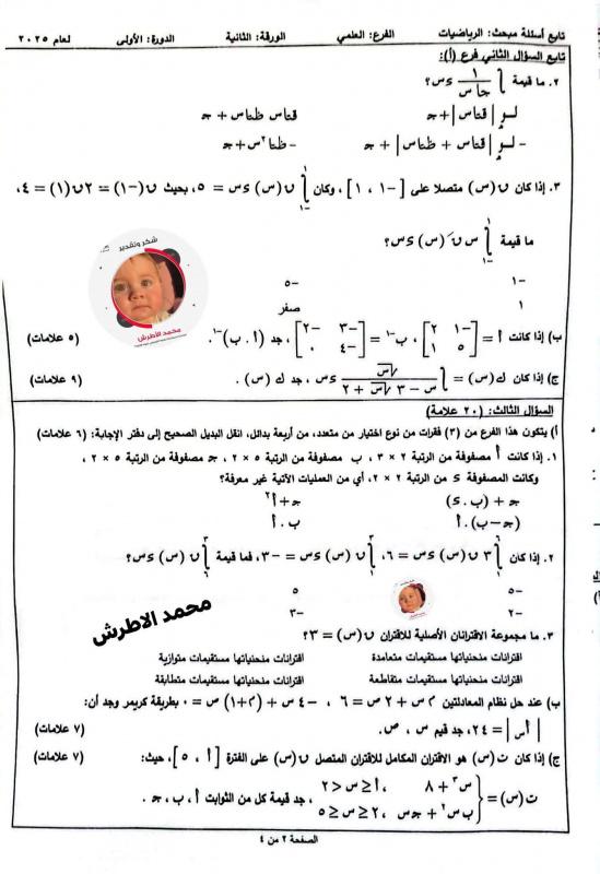 تفاصيل أسئلة امتحان الرياضيات 2025 (الورقة الثانية – الفرع العلمي)