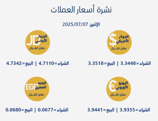 جاءت أسعار صرف العملات مقابل الشيقل الإسرائيلي، اليوم الإثنين، بحسب سلطة النقد الفلسطينية، على النحو التالي:
