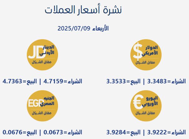 جاءت أسعار صرف العملات مقابل الشيقل الإسرائيلي، اليوم الأربعاء، بحسب سلطة النقد الفلسطينية، على النحو التالي:
