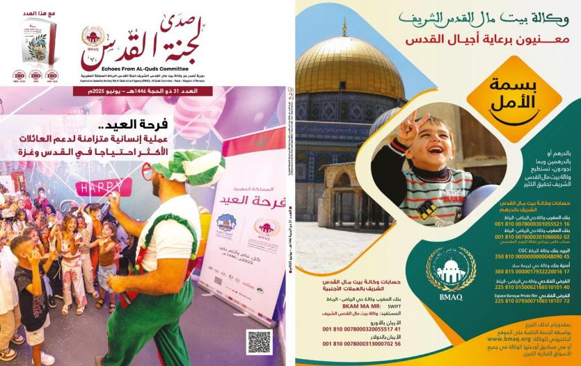 ويعيد العدد الجديد التذكير بمضامين الخطاب الملكي ، الذي وجهه الملك محمد السادس إلى القمة الرابعة والثلاثين لجامعة الدول العربية، التي عقدت في بغداد يومي 17 و 18 ماي 2025، وأكد فيه أنه "من منطلق المسؤولية الملقاة على عاتقنا، بصفتنا رئيسا للجنة القدس، سنواصل الدفاع عن المقدسات، وعلى رأسها القدس الشريف، من خلال المزاوجة بين العمل السياسي والدبلوماسي والعمل الميداني الذي تضطلع به وكالة بيت مال القدس."