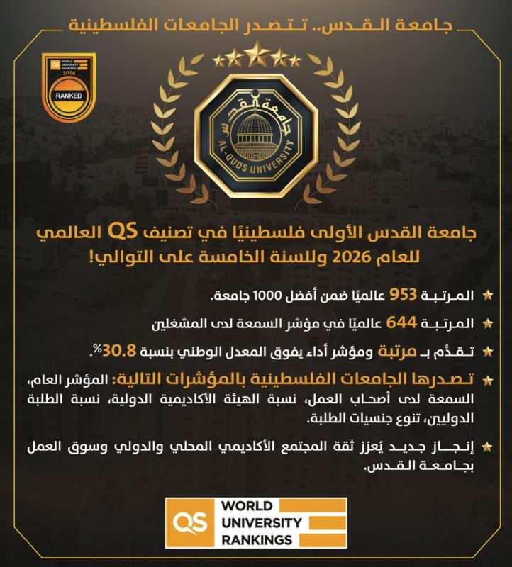 للعام الخامس على التوالي: جامعة القدس الأولى فلسطينيًا وبالمرتبة 953 عالميًا في تصنيف QS العالمي 2026