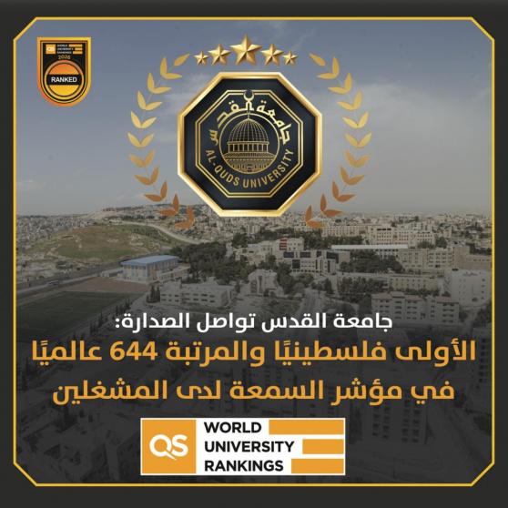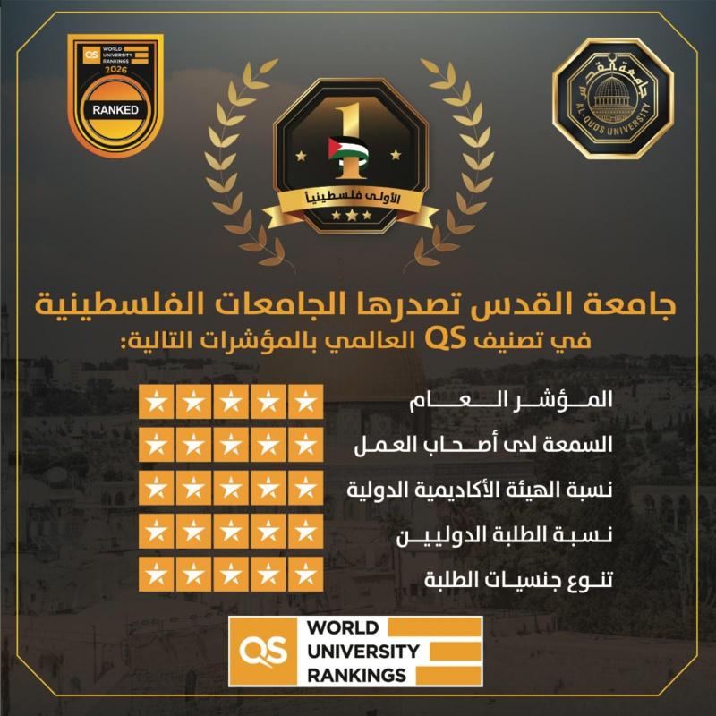 حصدت جامعة القدس المرتبة الأولى فلسطينيًا في تصنيف QS لدورة 2026 وللسنة الخامسة على التوالي، وهي الجامعة الوحيدة وطنيًا ضمن نادي أفضل 1000 جامعة حول العالم، حيث احتلت المرتبة 953 عالميًا لتسجل تقدمها بـ 119 مرتبة منذ دخولها التصنيف العالمي.