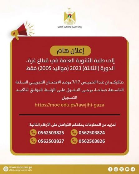 قالت وزارة التربية والتعليم العالي، اليوم الأربعاء، إنه سيتم عقد اختبار تجريبي يوم غدٍ لطلبة الثانوية العامة في قطاع غزة/ الدورة الثالثة - توجيهي 2005.