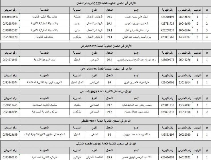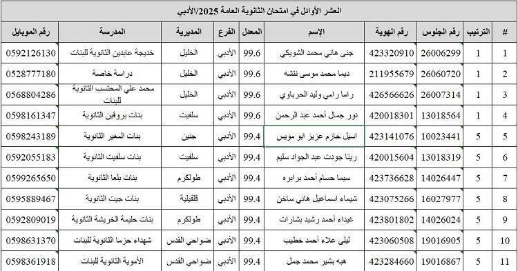 وحصل الطالب آدم ثائر خالد عامر من بلدة بلعا بمحافظة طولكرم، الأول في الفرع العلمي، بمعدل 99.7%، مدرسة ذكور شهداء بلعا الثانوية، ومن الفرع الأدبي جنى هاني محمد الشويكي 99.6% مدرسة خديجة عابدين الثانوية للبنات من مدينة الخليل.