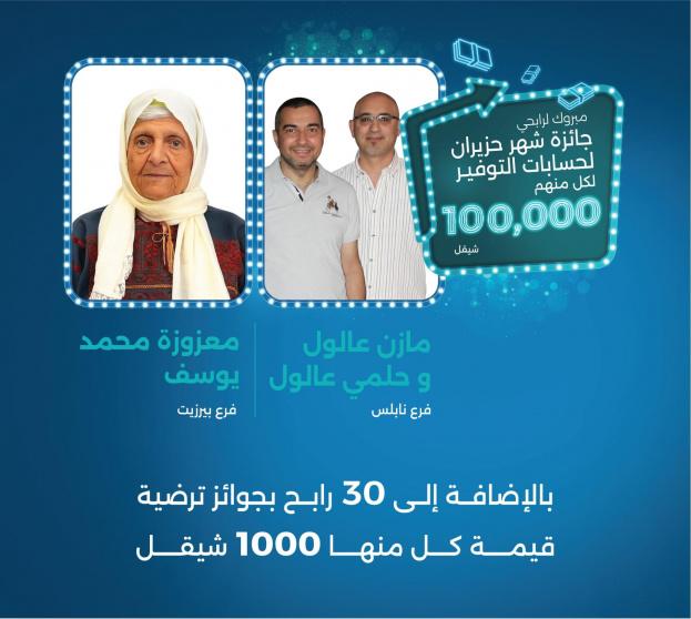 أعلن بنك الإسكان في فلسطين عن نتائج السحب على جوائز حسابات التوفير الربعية لشهر حزيران 2025، حيث فاز بالجائزة الربعية الكبرى، كل من معزوزة محمد يوسف من فرع بيرزيت ومازن ماجد حلمي عالول و حلمي راغب حلمي عالول من فرع نابلس (حساب مشترك)، والتي قيمتها 100,000 شيقل لكل رابح، بالإضافة الى 30 رابح بجوائز ترضية لكل منهم 1000 شيقل.