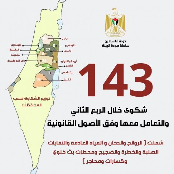 وبحسب التقرير، فقد بلغ إجمالي عدد الشكاوى البيئية المسجلة لدى المكاتب الفرعية لسلطة جودة البيئة في مختلف المحافظات (143) شكوى، جرى التعامل معها وفق الإجراءات القانونية والإدارية المعتمدة، في إطار برنامج الشكاوى المحوسب الذي تُشرف عليه الدائرة القانونية.