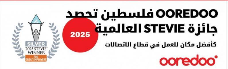 في إنجاز جديد يعكس التزامها العميق تجاه موظفيها، أعلنت شركة Ooredoo فلسطين عن فوزها بجائزة ستيفي الفضية العالمية ضمن فئة "أفضل بيئة عمل".