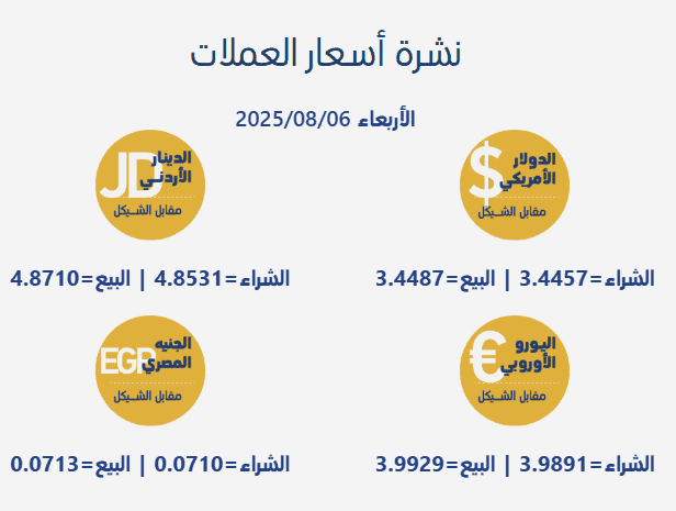 جاءت أسعار صرف العملات مقابل الشيقل الإسرائيلي، اليوم الأربعاء، بحسب سلطة النقد الفلسطينية، على النحو التالي: