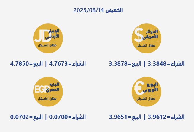 جاءت أسعار صرف العملات مقابل الشيقل الإسرائيلي، اليوم الخميس، بحسب سلطة النقد الفلسطينية، على النحو التالي: