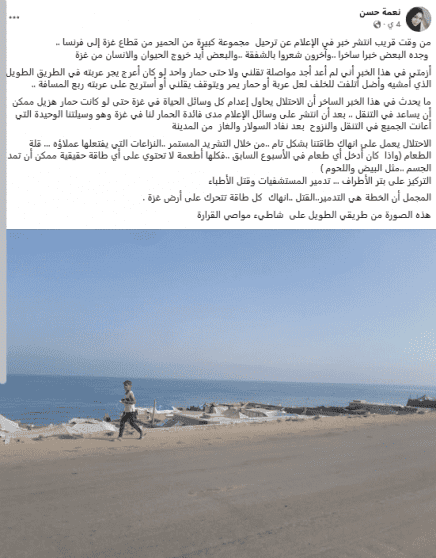 الكاتبة الغزية نعمة حسن لخّصت المشهد في شهادة موجعة كتبتها على صفحتها في "فيسبوك": لم أعد أجد مواصلة تقلني، ولا حتى حمار واحد لو كان أعرج يجر عربته في الطريق الطويل الذي أمشيه... الاحتلال يحاول إعدام كل وسائل الحياة في غزة حتى لو كانت حماراً هزيلاً.