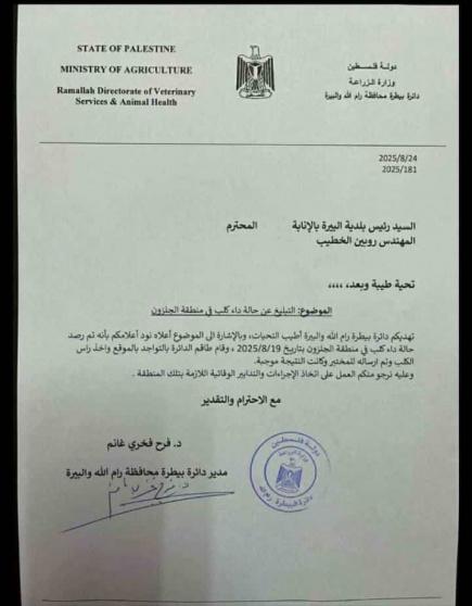 وفي توضيح رسمي حول الحادثة، أصدرت دائرة البيطرة في محافظة رام الله والبيرة، التابعة لوزارة الزراعة الفلسطينية، كتاباً موجهاً إلى رئيس بلدية البيرة، أبلغته فيه برصد حالة داء كلب مثبتة في منطقة الجنان بتاريخ 19/8/2025، وذلك بعد فحص الكلب في مختبرات الوزارة المركزية.