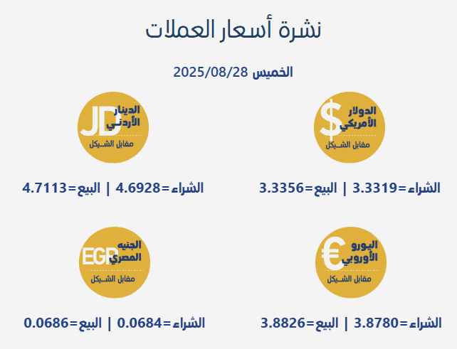 جاءت أسعار صرف العملات مقابل الشيقل الإسرائيلي، اليوم الخميس، بحسب سلطة النقد الفلسطينية، على النحو التالي:
