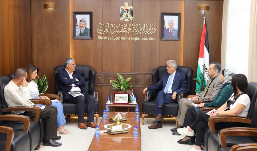 بحث وزير التربية والتعليم العالي د. أمجد برهم، في مكتبه، اليوم، مع مدير عام مؤسسة التعاون في فلسطين د. طارق إمطيرة سبل تعزيز الدعم لقطاع التعليم الفلسطيني بشقيه العام والعالي.