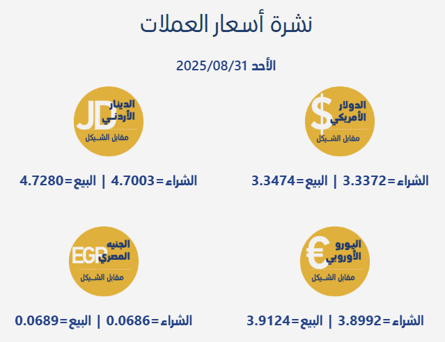 جاءت أسعار صرف العملات مقابل الشيقل الإسرائيلي، اليوم الأحد، بحسب سلطة النقد الفلسطينية، على النحو التالي: