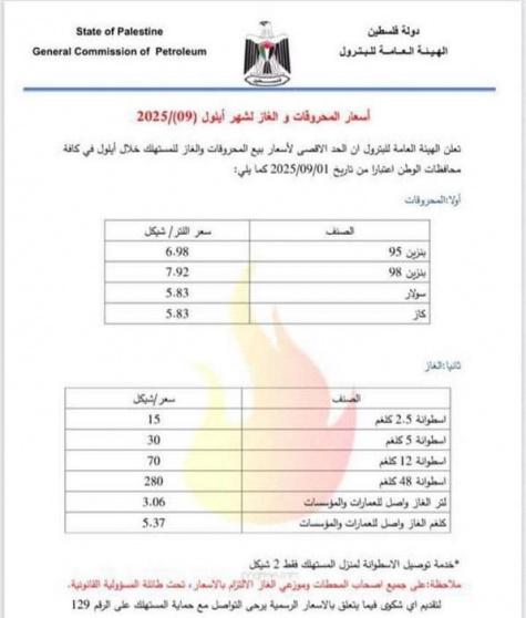 أعلنت الهيئة العامة للبترول، مساء اليوم الأحد، أسعار المحروقات والغاز لشهر أيلول (9/2025)، على النحو التالي: