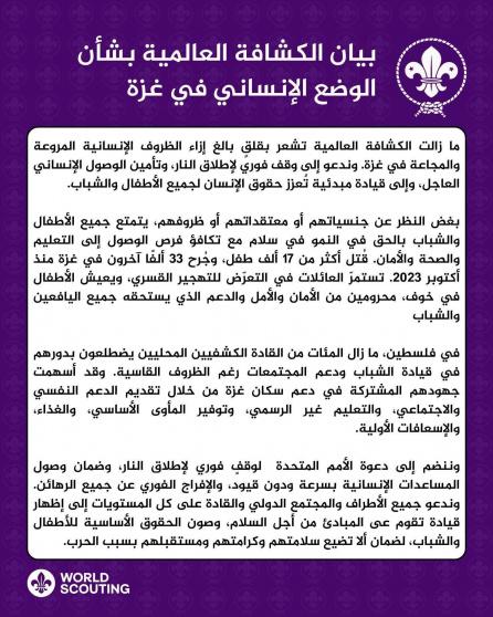 وشددت الكشافة العالمية على انضمامها إلى دعوة الأمم المتحدة لوقفٍ فوري لإطلاق النار، وضمان وصول المساعدات الإنسانية دون قيود، والإفراج الفوري عن جميع الرهائن، داعية المجتمع الدولي وقادة العالم إلى إظهار قيادة قائمة على المبادئ من أجل السلام، وحماية حقوق الأطفال والشباب في فلسطين.
