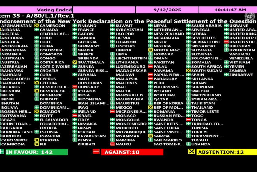 صوتت الجمعية العامة للأمم المتحدة، اليوم الجمعة، على مشروع قرار يؤيد إعلان "نيويورك" بشأن تنفيذ حل الدولتين، وإقامة دولة فلسطينية مستقلة.