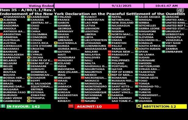 وأوضح أن هذه المواقف وجدت تعبيرًا عمليًا يوم الجمعة 12 سبتمبر 2025، حين صوّتت كازاخستان بـ"نعم" لصالح مشروع القرار الفلسطيني في الجمعية العامة للأمم المتحدة، والذي حاز تأييد 146 دولة مقابل معارضة 10 فقط، الأمر الذي يؤكد مجددًا التزام كازاخستان الراسخ بدعم القضايا العادلة على الساحة الدولية.