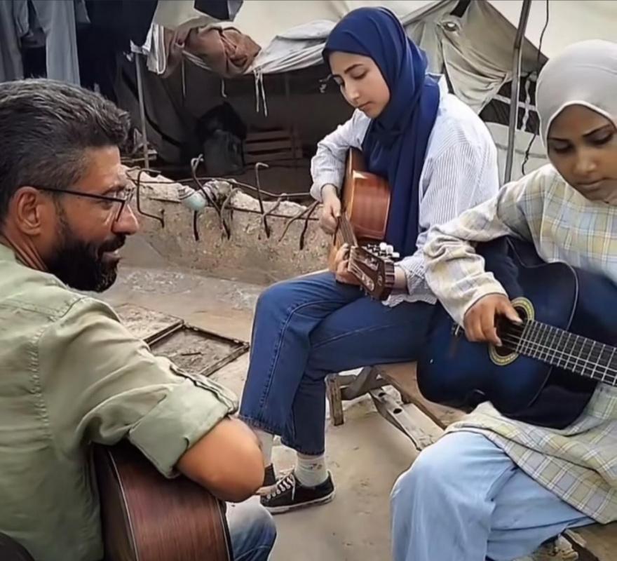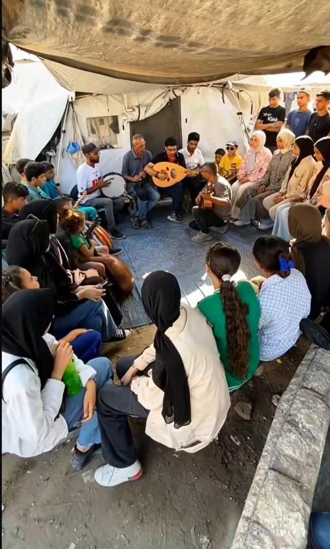 في مخيم صغير بين عشرات الخيام، حيث تعب الأجساد واضح على الوجوه، يجتمع مجموعة من الأطفال والشبان ليعزفوا بأدوات متواضعة: عود قديم، دف متهالك، وأصوات تحمل ما لا تحتمل. وما إن يبدأ العزف حتى يتحول المكان إلى مسرح، والخيمة إلى مساحة فرح مؤقت، يلتف حولها الأطفال بملامح مرهقة لكنها تبتسم رغم الألم.