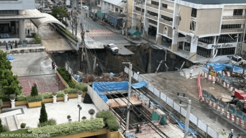 شهدت العاصمة التايلاندية بانكوك، اليوم الأربعاء، انهيارا مفاجئا لطريق رئيسي، ما أدى إلى تشكل حفرة هائلة بعمق يصل إلى 50 مترا.