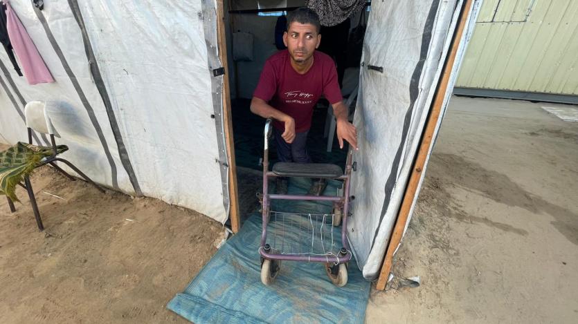 ويقول بحزن واضح: "أصبحت أقف أمام طوابير المياه عاجزًا عن حمل عبوة واحدة، بعدما كنت إنسانًا منتجًا ومسؤولًا عن إعالة أسرتي. اليوم لا أستطيع التحرك سوى مترين خارج خيمتي."