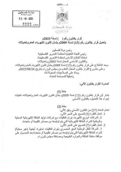 أصدر الرئيس محمود عباس قراراً بقانون بشأن تعديل قانون الكهرباء العام 2025.