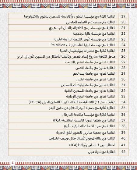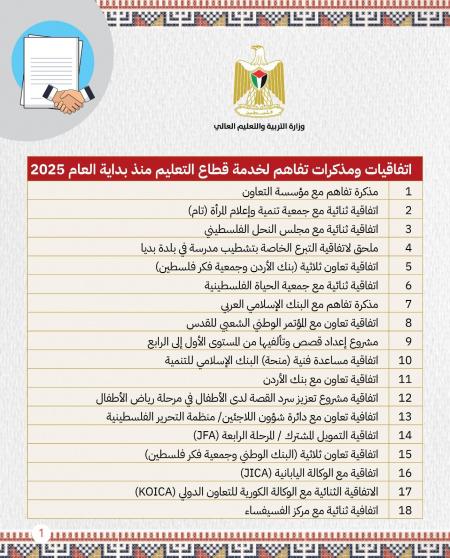 وقّعت وزارة التربية والتعليم العالي منذ مطلع العام 2025 سلسلة من الاتفاقيات ومذكرات التفاهم مع عدد من المؤسسات الدولية والمحلية، بهدف تعزيز وتطوير قطاعي التعليم العام والعالي في فلسطين.
