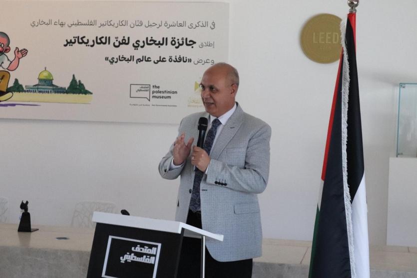 وأضاف حمدان: أننا في وزارة الثقافة، وبالشراكة مع المتحف الفلسطيني، نطلق "جائزة بهاء البخاري لفن الكاريكاتير"، وفاء لروحه المبدعة، وتكريماً لمسيرته الفنية التي لم تعرف المساومة أو الحياد، بل آمنت بأن الفن هو شكلٌ من أشكال النضال، وأن الريشة والقلم قادران على زلزلة الصمت وحمل الحقيقة.