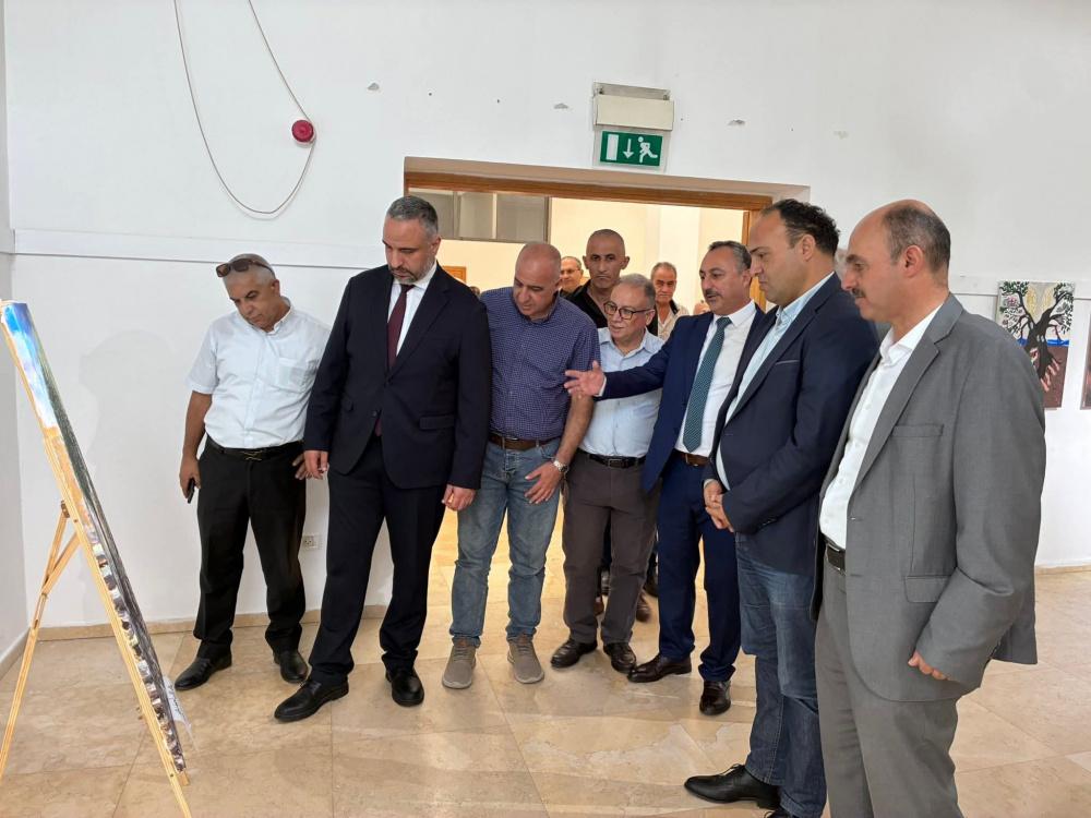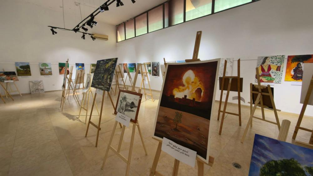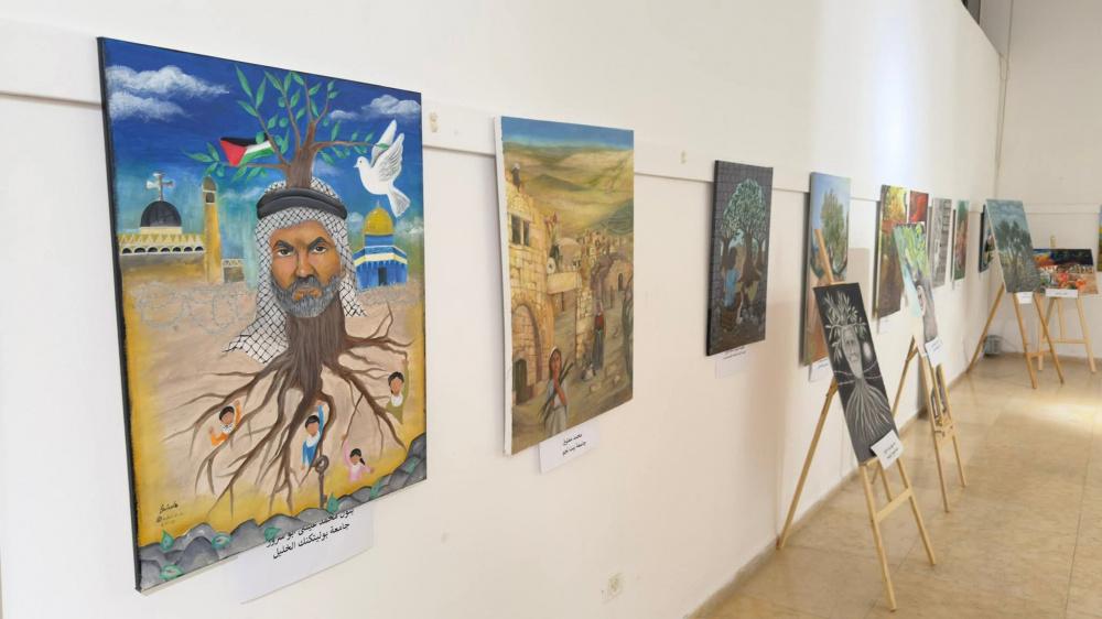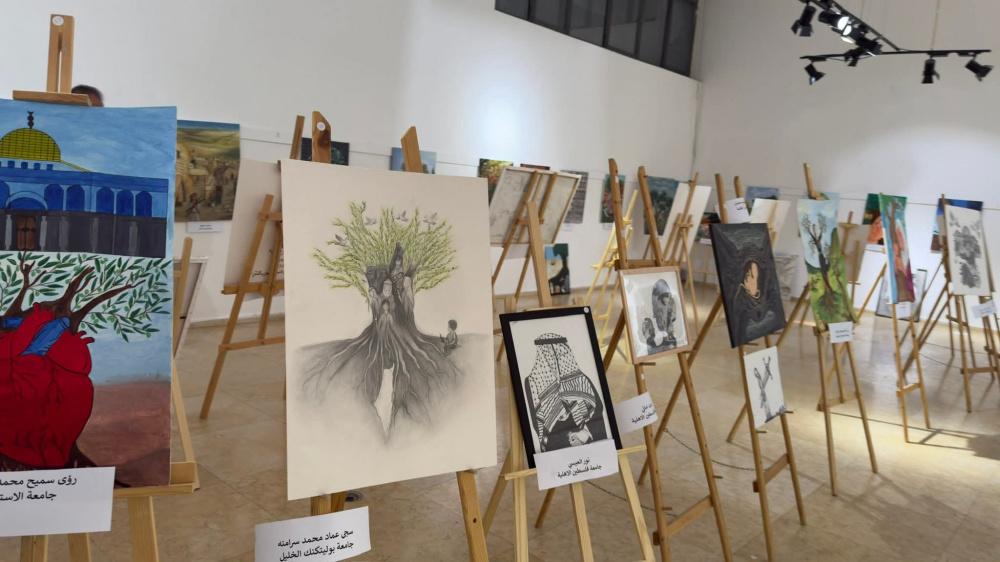 وتجول المشاركون في المعرض الفني لمسابقة (باقون كجذور الزيتون) لطلبة مؤسسات التعليم العالي، الذي نظم بالشراكة مع وزارة التربية والتعليم العالي مع 11 جامعة، وشمل 91 لوحة.