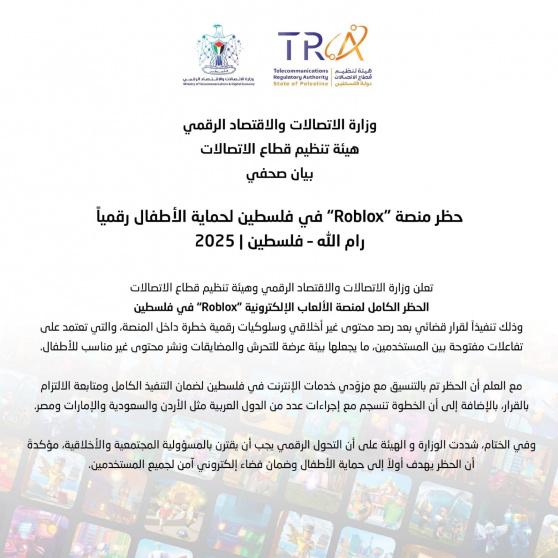 أعلنت وزارة الاتصالات والاقتصاد الرقمي وهيئة تنظيم قطاع الاتصالات الحظر الكامل لمنصة الألعاب الإلكترونية “Roblox” في فلسطين، وذلك تنفيذاً لقرار قضائي بعد رصد محتوى غير أخلاقي وسلوكيات رقمية خطرة داخل المنصة، والتي تعتمد على تفاعلات مفتوحة بين المستخدمين، ما يجعلها بيئة عرضة للتحرش والمضايقات ونشر محتوى غير مناسب للأطفال.