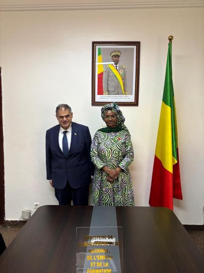 بحث سفير دولة فلسطين لدى جمهورية مالي، حسّان البلعاوي، مع وزيرة ريادة الأعمال الوطنية والتشغيل والتكوين المهني، أومو سال سيك، سبل تعزيز التعاون الثنائي بين البلدين في مجالات التأهيل والتكوين المهني، وتبادل الخبرات، وتنفيذ برامج مشتركة تعود بالنفع على الشباب والطلبة في فلسطين ومالي.