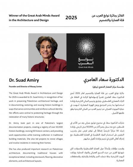 وتم منح جائزة نوابغ العرب عن فئة العمارة والتصميم لعام 2025 للدكتورة سعاد العامري، مؤسِسة ومديرة مركز المعمار الشعبي "رِواق"، تقديراً لإسهاماتها الرائدة في الحفاظ على التراث المعماري الفلسطيني، وتوثيق وترميم المباني التاريخية وإعادة استخدامها بما يخدم المجتمع ويعزز الهوية المعمارية. وقد ساهمت أعمالها في الحفاظ على الموروث العمراني الفلسطيني من خلال ترميم مجموعة واسعة من المباني وفق تصميمها التاريخي.