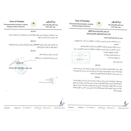وأكدت هيئة تنظيم قطاع الاتصالات أن هذا القرار يأتي ضمن رؤيتها الرامية إلى تنظيم سوق أجهزة الهواتف الخلوية، والحد من إدخال الأجهزة غير المطابقة للمواصفات الفنية والقانونية، وتعزيز الشفافية والمنافسة العادلة، وضمان حماية المستهلك من خلال توفير خدمات الصيانة الفنية المعتمدة وقطع الغيار الأصلية للأجهزة المتداولة في السوق الفلسطيني، وبما يحقق المصلحة العامة ويخدم المواطنين في دولة فلسطين.