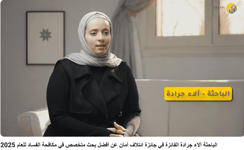 فازت الباحثة آلاء جرادة بجائزة أفضل بحث متخصص في مكافحة الفساد للعام 2025 عن فئة البكالوريوس عن بحثها بعنوان: "مكافحة الفساد في توزيع المساعدات إبان الإبادة الجماعية في قطاع غزة". ركز البحث على دور الفساد في تفاقم معاناة المدنيين خلال المجاعة التي أعلنت الأمم المتحدة عنها رسميًا في 2025. اعتمدت الباحثة المنهج التحليلي للنصوص القانونية وأجرت مقابلات مع شخصيات قانونية وأكاديمية، إلى جانب توزيع استبانة لرصد واقع النزاهة في توزيع المساعدات الإنسانية.