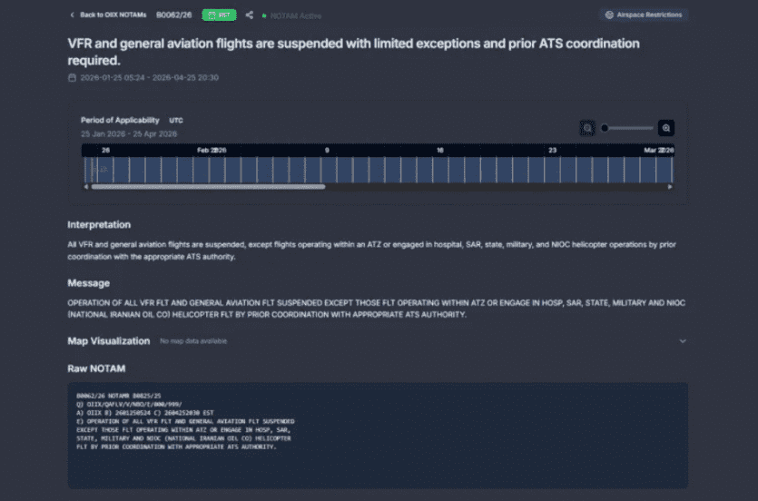 وأصدرت السلطات في طهران إشعارا ملاحيا يشمل كل الرحلات المعتمدة على التواصل البصري، حيث يعتمد الطيار على الرؤية والظروف الجوية الملائمة بدلا من الطيران بالأجهزة، بالإضافة إلى تعليق الطيران العام (غير التجاري) والذي يشمل من بين أنواعه، طائرات التدريب والطائرات الخاصة.