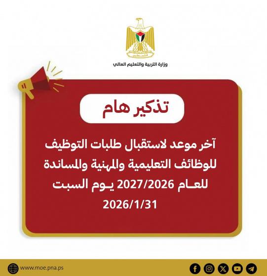 أعلنت وزارة التربية والتعليم العالي، أن يوم السبت 31/012026 هو آخر موعد لاستقبال طلبات التوظيف للوظائف التعليمية والمهنية والمساندة للعام الدراسي 2026/2027، وذلك من خلال البوابة الإلكترونية لديوان الموظفين العام www.gpc.pna.ps، وفقاً لإعلان الوزارة السابق.