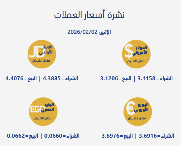 جاءت أسعار صرف العملات مقابل الشيقل الإسرائيلي، اليوم الإثنين، بحسب سلطة النقد الفلسطينية، على النحو التالي: