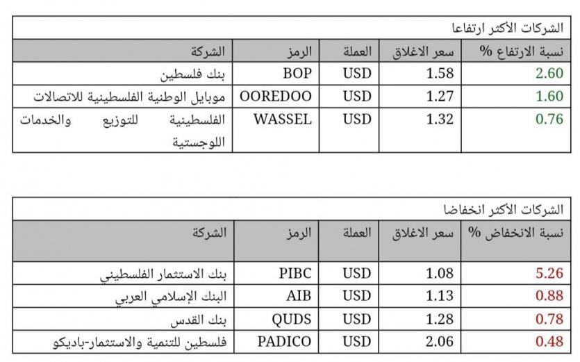 شهدت جلسة اليوم تداولات بلغت قيمتها 265,763 دولار، فيما بلغ الحجم الإجمالي للأسهم 160,420 سهما، وشهد السوق اليوم 97 صفقة، حيث تركزت السيولة في تداولات اليوم بنسبة 53% على أسهم العربية الفلسطينية للاستثمار "أيبك".