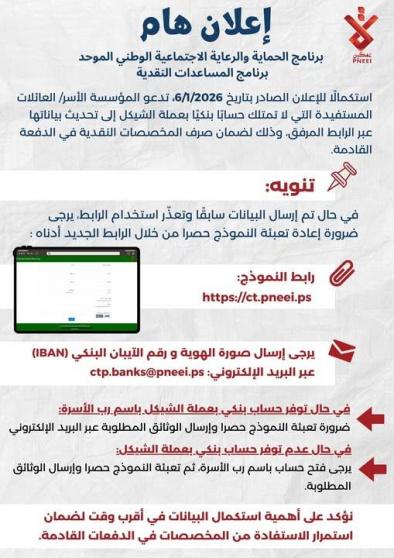 ووفق ذلك، على الأهالي أسر الشهداء والجرحى والأسرى الدخول إلى رابط التسجيل في مؤسسة تمكين 2026 وأصدرت تنويها للعائلات التي لا تمتلك حسابا بنكيا بعملة الشيكل لتحديث بياناتها.