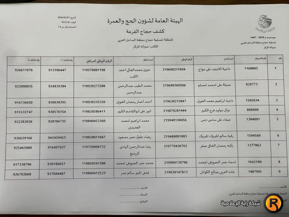 حجاج تنسيقية الساحل الغربي.. نتائج أسماء الفائزين في قرعة الحج ليبيا 2026 عن مكتب الجديدة
