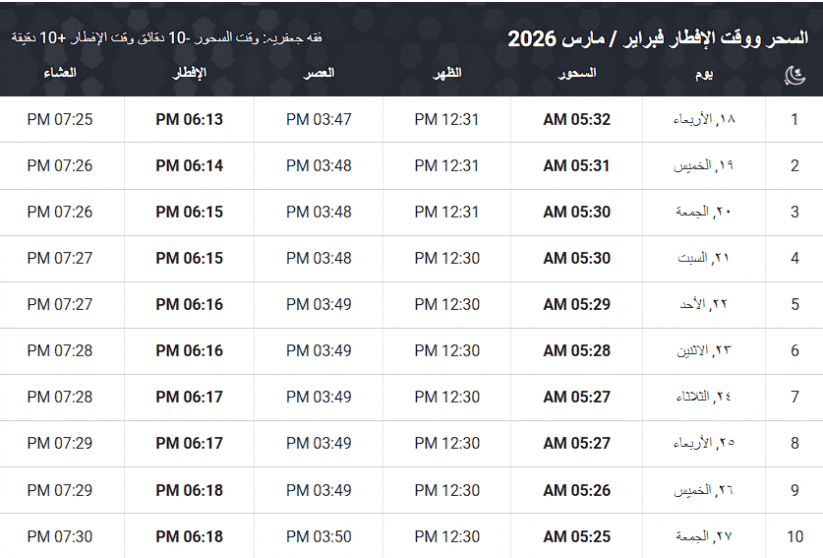 وقت الإمساك: قبل أذان الفجر بـ 10 دقائق لضمان الاستعداد للصيام.