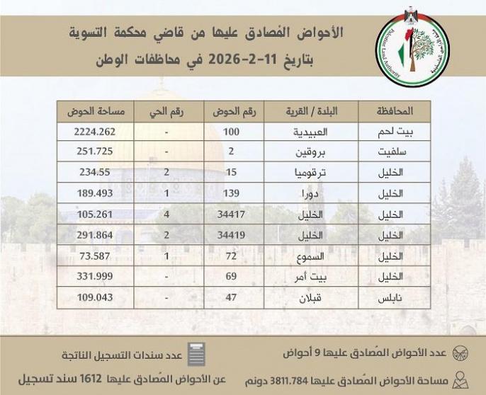 أعلنت سلطة الأراضي عن إنجاز جديد ضمن أعمال مشروع تسوية الأراضي، تمثل في المصادقة على 9 أحواض تسوية من قبل قاضي محكمة التسوية، بمساحة إجمالية بلغت 3811.784 دونما، وإصدار 1612 سند تسجيل بعد استكمال الإجراءات القانونية المعتمدة.