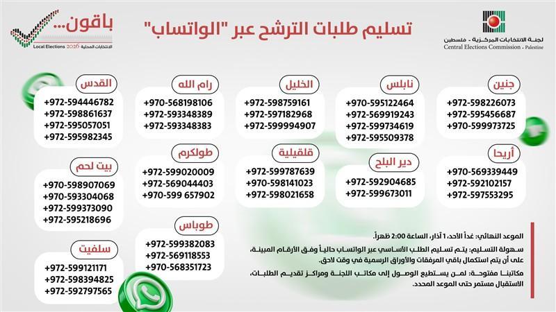 ودعت اللجنة المواطنين الراغبين بتقديم طلبات الترشح، سواء كأفراد لعضوية المجالس القروية أو كقوائم للمجالس البلدية، والذين يتعذر عليهم الوصول إلى مكاتب اللجنة ومراكز تقديم الطلبات، إلى إرسال طلباتهم عبر أرقام الواتساب المبينة أدناه كل حسب الدائرة الانتخابية التابع لها في موعد أقصاه الساعة الثانية من ظهر يوم الاحد 1 آذار.  وأوضحت اللجنة أنها خصصت ثلاثة أرقام واتساب لكل دائرة انتخابية لتلقي الطلبات بطريقة ميسرة وسريعة.