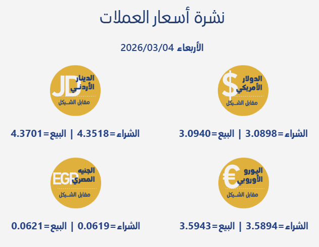 جاءت أسعار صرف العملات مقابل الشيقل الإسرائيلي، اليوم الأربعاء، بحسب سلطة النقد الفلسطينية، على النحو التالي: