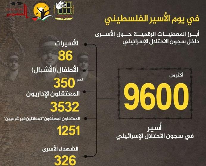 أكدت مؤسسات الأسرى، أن عدد الأسرى الفلسطينيين والعرب في سجون الاحتلال تجاوز 9600 أسير وأسيرة حتى بداية نيسان/أبريل 2026، بارتفاع نسبته 83% مقارنة بما كان عليه قبل حرب الإبادة.