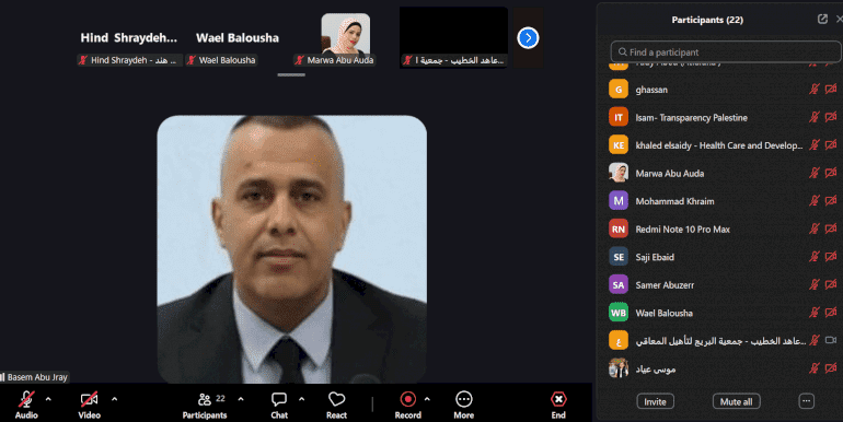 بمشاركة الفاعلين في القطاع الصحي وممثلي المؤسسات الأهلية العاملة في مجال الرصد والرقابة؛ عقد الائتلاف من أجل النزاهة والمساءلة (أمان) جلسة افتراضية عبر منصة زووم حول "الرقابة المجتمعية كمدخل لتعزيز الوقاية من مخاطر الفساد في القطاع الصحي في قطاع غزة وتعزيز النزاهة والعدالة في إدارة الخدمات الصحية في سياق التعافي المبكر"، حيث ركزت الجلسة على أهمية تعزيز دور المؤسسات الأهلية في الرصد والمساءلة، وبناء شبكات مجتمعية فاعلة تسهم في سد الفجوات الرقابية وتعزيز الشفافية في إدارة الخدمات العامة، خاصة في ظل الظروف الصعبة التي يمر بها القطاع الصحي.