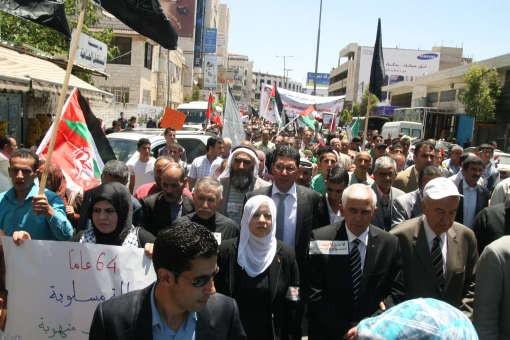 من جهته، أكد منسق اللجنة العليا لإحياء ذكرى النكبة محمد عليان أن الشعب الفلسطيني يستعيد في هذه الأيام ذكرى النكبة الأليمة التي ألمت به قبل 64 عاما، وهي ذكرى تشريد شعب هجر من أرضه ودياره.وأضاف تأتي الذكرى في هذا العام وقد انتصر الأسرى في معركة الحرية، وهؤلاء الأبطال خلف القضبان سطروا أروع أشكال النضال، ورفضوا الاستسلام، وانتصروا بإضرابهم عن الطعام وأمعائهم الخاوية على السجان.وقال أحمد عرام في كلمة القوى الوطنية إنه رغم المسافة الزمنية الطويلة والمرة ما زال شعبنا يدفع ثمنا باهظا لجرحه المفتوح على مصراعيه ولاستلابه لكيانه ولعملية تطهير التاريخ التي يصل الاحتلال الليل بالنهار لإكمالها والمضي فيها'.