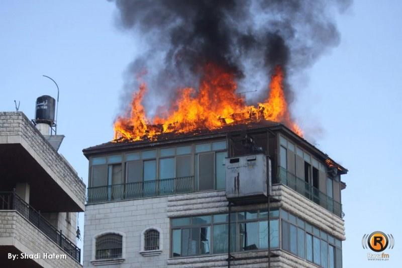 اندلع قبل قليل حريق كبير في الطوابق العليا من مبنى بالقرب من جمعية الهلال الأحمر في شارع القدس بمدينة رام الله.