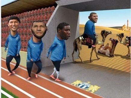 الكاريكاتير يظهر فيه لاعبون تونسيون محترفون في نادي أف سي زيوريخ وبعضهم يمتطي ظهر جمل في الصحراء.